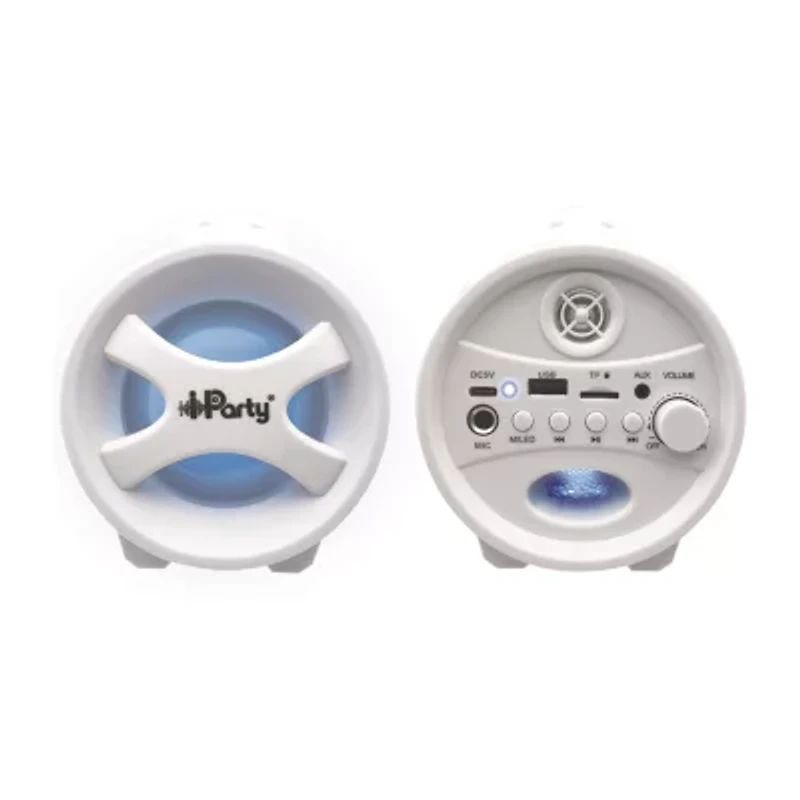 iParty Portable Bluetooth Speaker offers multicolor light effects, powerful speaker output sound of 4 watts RMS and built-in microphone with karaoke function. Includes a rechargeable battery, FM radio, USB port, and microphone. The speaker can be connected to other audio devices and two speakers can be sync together to enjoy amazing stereo sound at your next party.