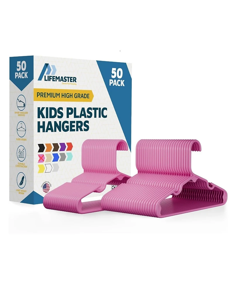 Lifemaster Kids Plastic Hangers, Pink, 11.6", with shoulder notches, space-saving, hold 5 lbs, ideal for baby, toddler & kids clothes, 50-pack.