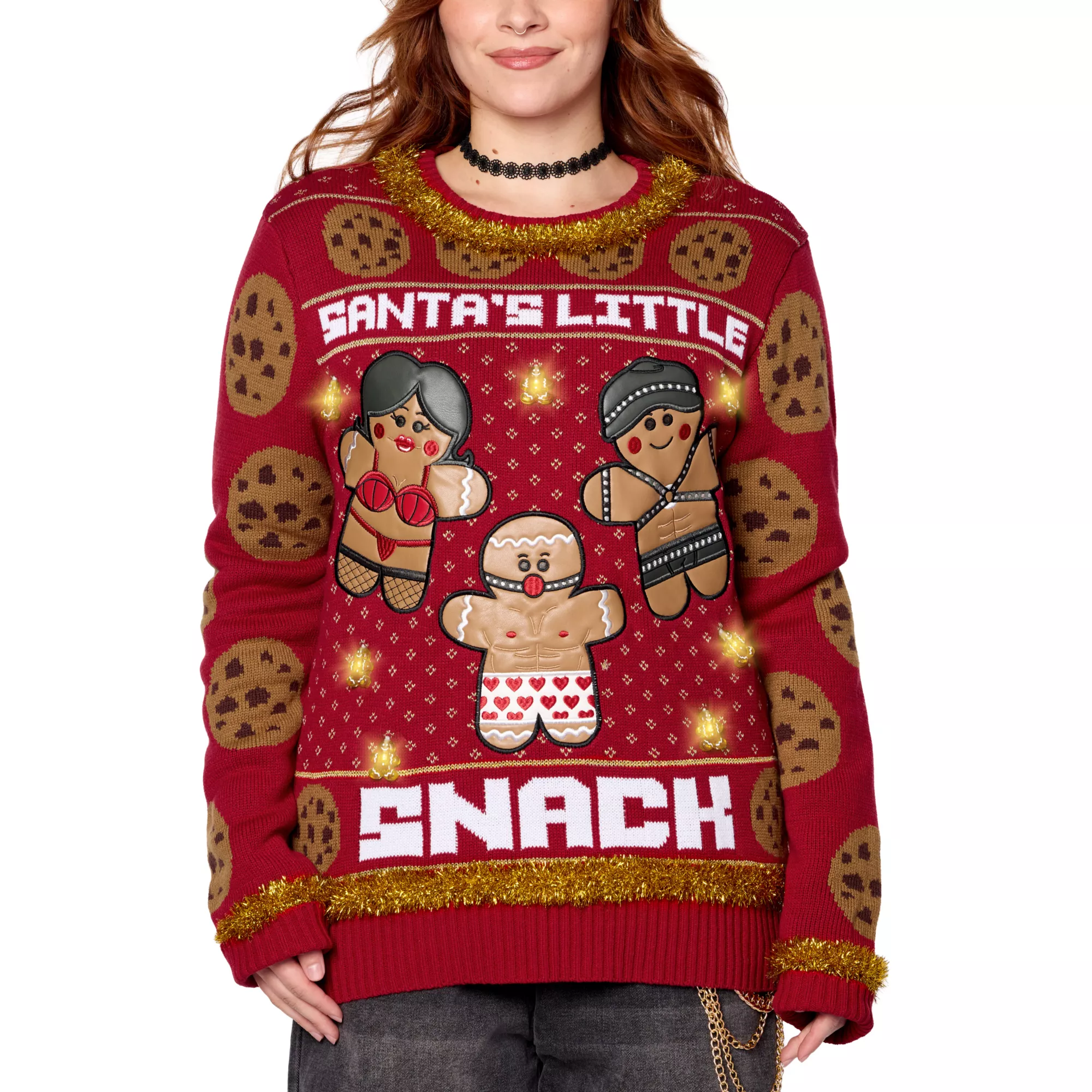 They might seem sweet, but these cookies aren't as innocent as they look. Go for gasps this holiday season when you rock this Light-Up Santa's Little Snack Christmas Sweater, featuring three light-up patterns, gold-tone garland, and embroidered images of kinky little gingerbread men that'll certainly stir things up at your Christmas celebration.