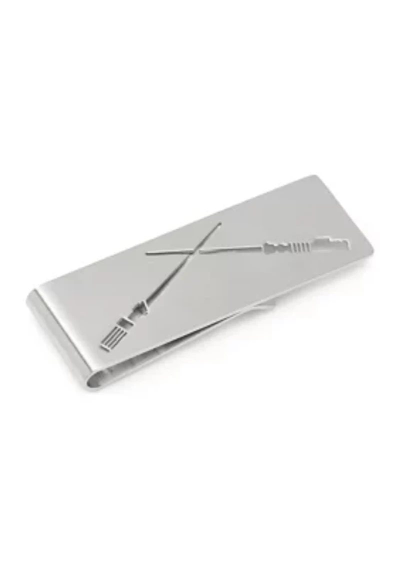 Is there a sound more iconic than that of two lightsabers clashing together? We don't think so. Feel free to recreate it as you use this simple yet sturdy brushed-metal finish money clip, featuring two cutout classic 'sabers dueling to the end. Officially licensed by Lucasfilm LTD. Imported Material & Care Metal Clean with a soft cloth.