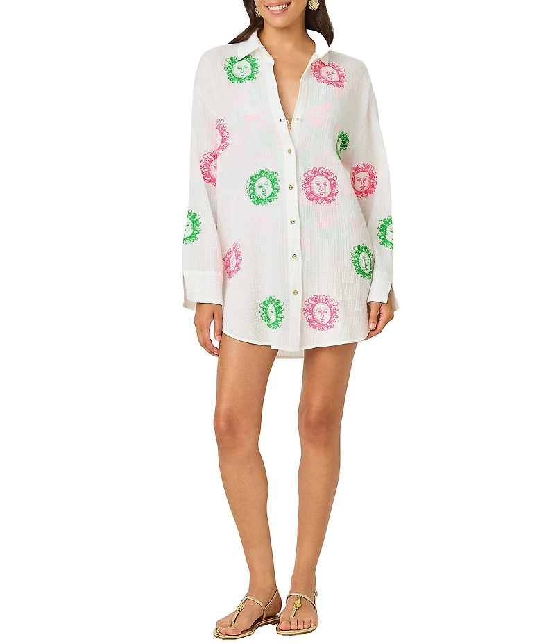 From Lilly Pulitzer, this swim cover-up features: Gauze fabrication Shirt silhouette Relaxed fit Long sleeves Embroidered Button front closure Cotton Machine wash or dry clean Imported.