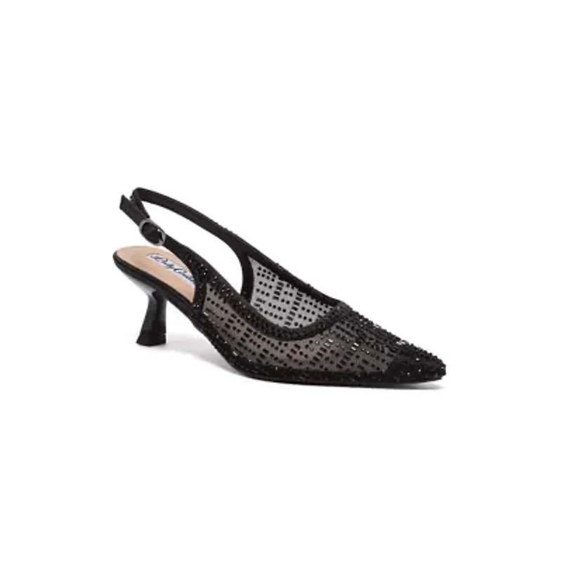 Step into the spotlight with these shimmering slingback heels. The entire upper sparkles with an intricate array of dazzling embellishments. A sophisticated pointed toe enhances their elegant silhouette. These shoes are finished with a chic, modern kitten heel, perfect for any special occasion. Buckle closure CHINA Imported Product Specifications 2" M Material Satin