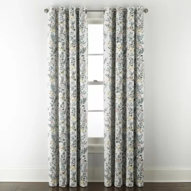 This Linden Street Bayshore single curtain panel has a blackout design that's fully lined to block light, provide privacy, save energy, and feature brushed silver-tone grommets. It's made from durable recycled woven fabric with a floral pattern, and STANDARD 100 by OEKO-TEX® certifies this product has been tested and verified free from over 300 harmful substances.