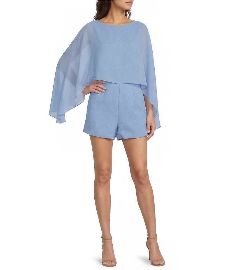 From Line and Dot, this romper features: Chiffon fabrication Round neckline Sleeveless Sheer cape detail Back zipper closure Side seam pocket detail Lined Approx. 15" front rise, 2.125" inseam, 12.5" leg opening Self: Polyester, Spandex Lined: Polyester Dry clean Imported.