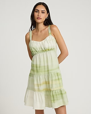 A casual mini dress in a lightweight linen-blend fabric and a fun green print. This style features a flattering sweetheart neckline, adjustable straps, a ruched bodice, a tiered skirt, a back zipper closure, and a double lining.