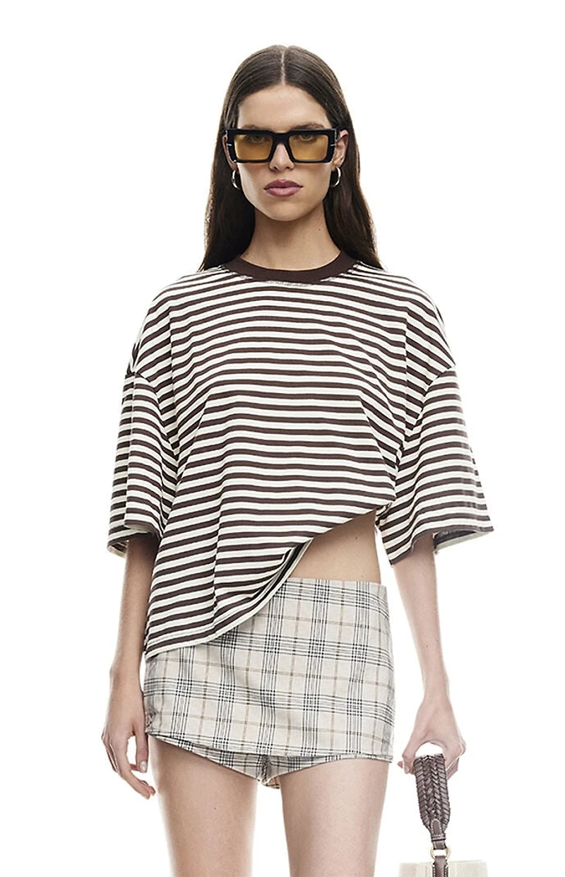 The Bloom Striped Short Sleeve T-Shirt from Lioness blends relaxed comfort with effortless style. Featuring a striped print, short sleeves with dropped shoulders, a contrast crew neckline, and an oversized boxy fit, it’s a cool, casual essential with standout attitude.