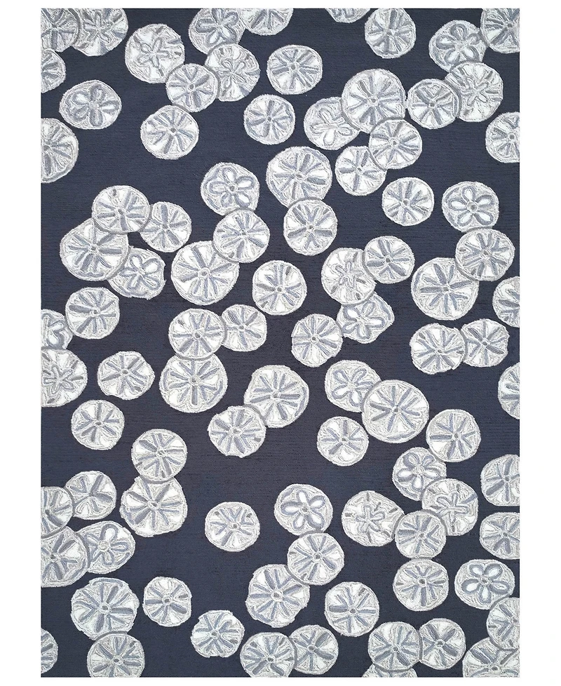 The Sea Biscuit decorative mat features an ocean inspired novelty mat with scattered sand dollars in richly blended colors of grey and ivory on a navy background adding a coastal vibe to your indoor or outdoor space.