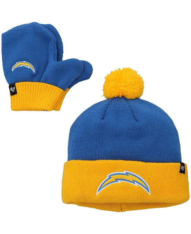 Little Boys and Girls '47 Brand Powder Blue, Gold Los Angeles Chargers Bam Bam Cuffed Knit Hat with Pom and Mittens Set