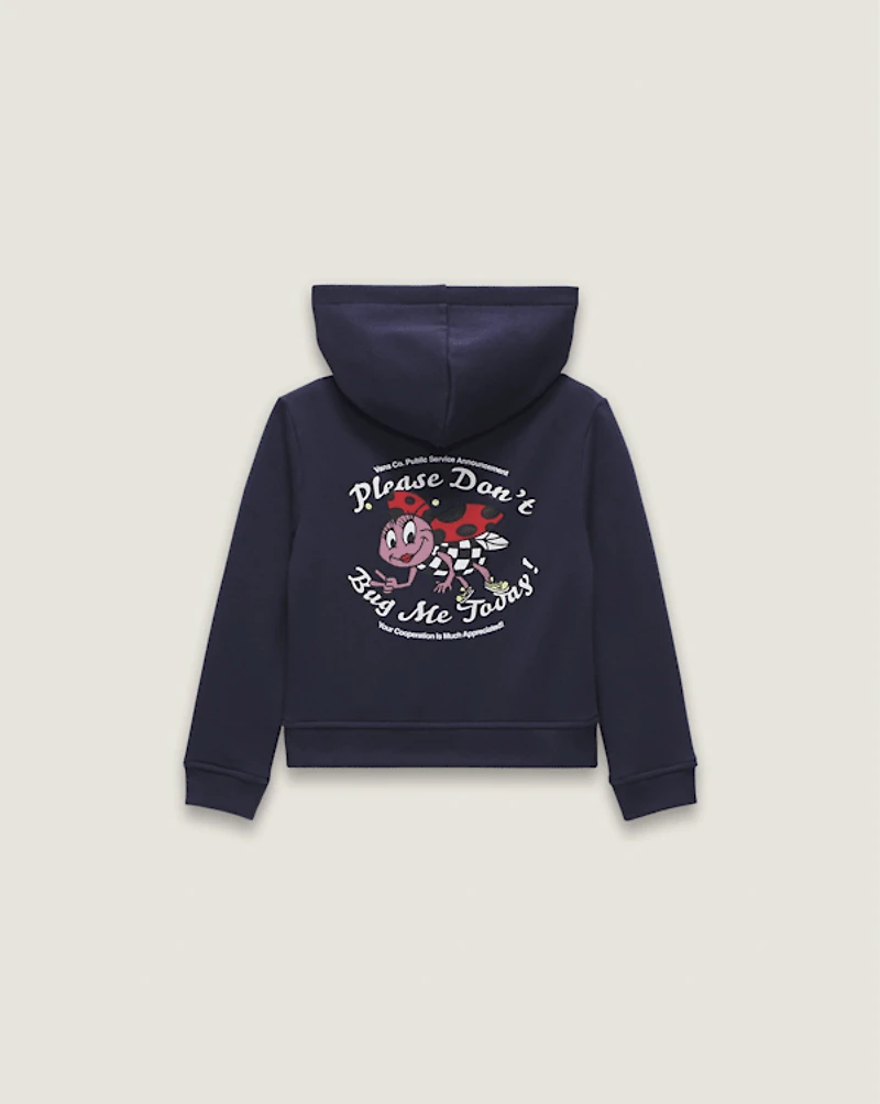 The Little Kids Don't Bug Me Zip Hoodie is a zip front hoodie with a slimmer fit. It also features ribbed details with a screenprinted graphic of a Vans® logo sitting on a ladybug on the front, and a larger graphic of the same with a ''don't bug me'' message on the back.