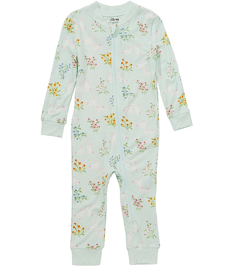 From Little Me, this coverall features: Allover bunny print Solid neckline, cuffs and leg hems Long sleeves Zip-front closure Viscose from bamboo/spandex Machine wash/tumble dry Imported.