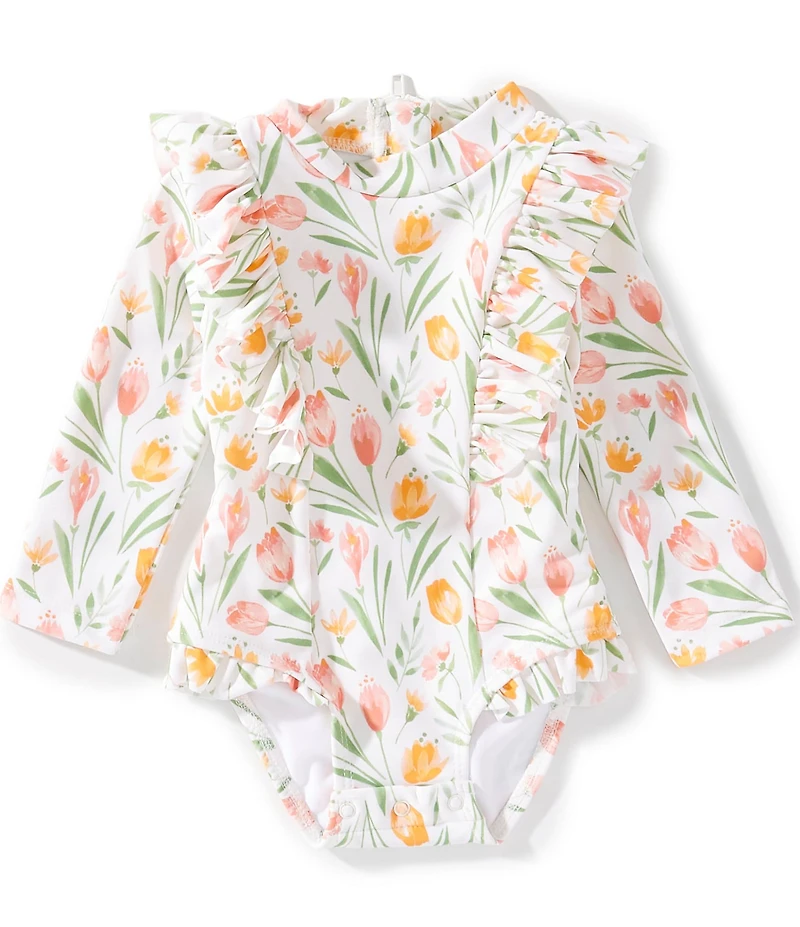 From Little Me, this rashguard features: Round neckline Long sleeves Ruffles on both shoulders that continue down the front Ruffled leg openings Snap back and snap-leg closures to make changing easy Nylon/spandex Machine wash/line dry Imported.