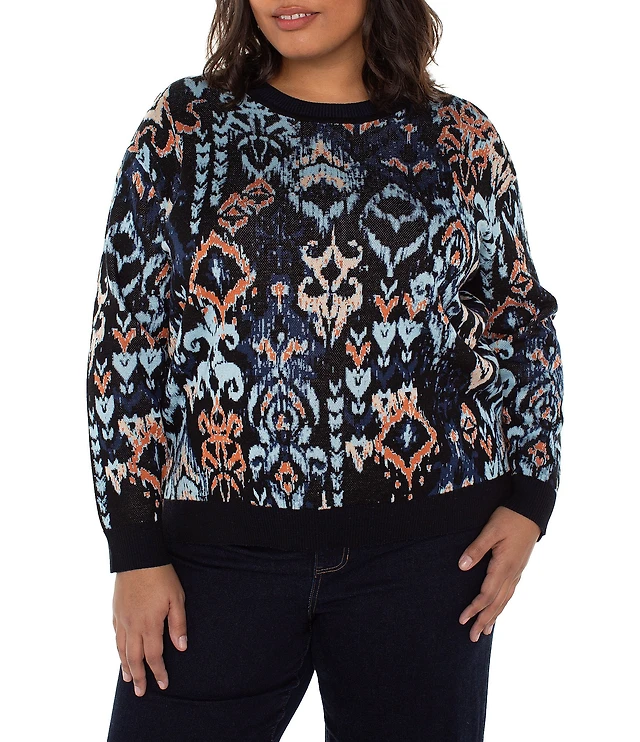 Liverpool Los Angeles Plus Size Jacquard Yarn Multi Ikat Print Crew Neck Long Sleeve Sweater