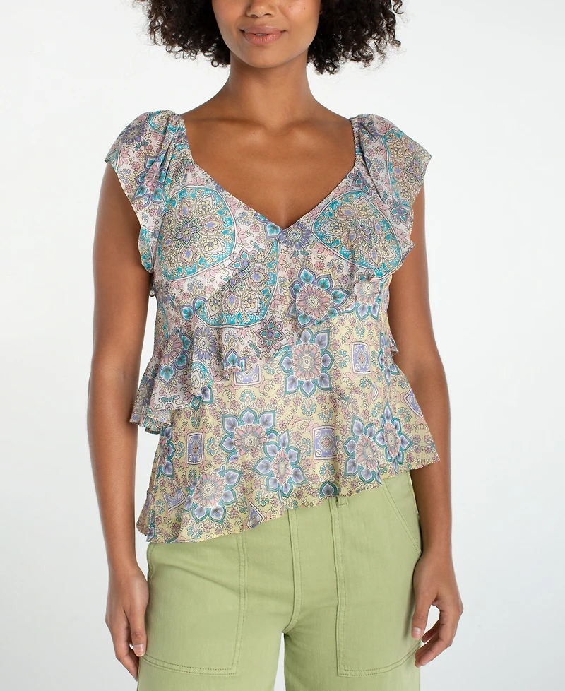 Modern ease defines this Liverpool Los Angeles top, featuring a V-neck that offers breathable comfort throughout busy schedules. Short-sleeve flutter shaping supports airflow and a pull-on style simplifies dressing. Asymmetrical hem enhances movement while maintaining relaxed structure.
