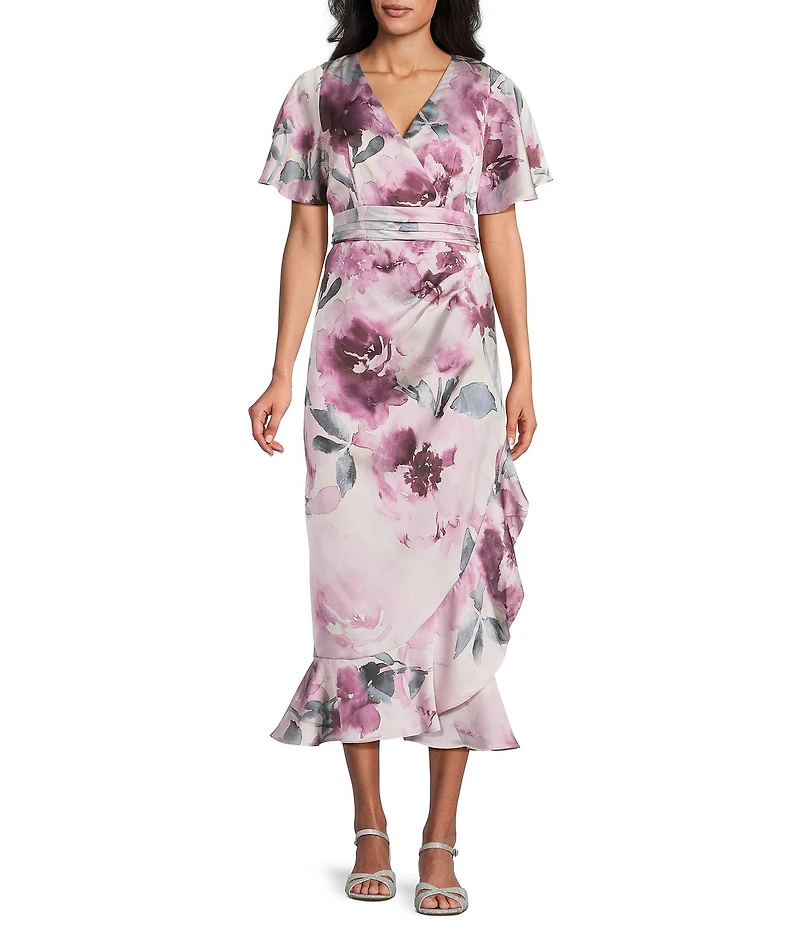 Livia Jolie By Le Bos Floral Print Mock Wrap Flutter Sleeve Midi Dress