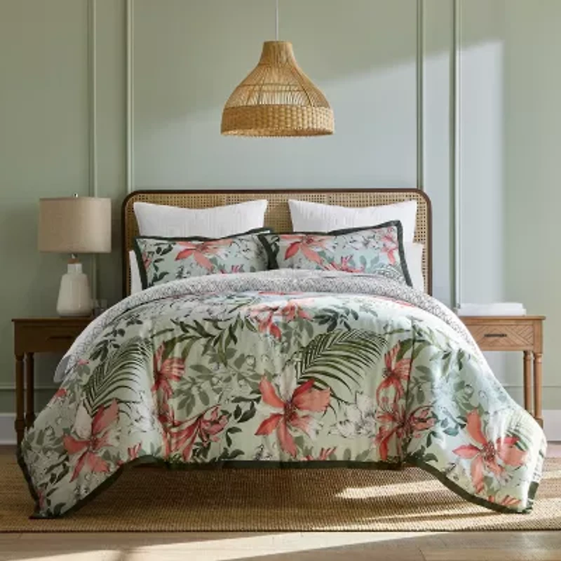 This Liz Claiborne Ellis 3-piece comforter set features a stylish tropical floral pattern, making it a home decor essential reminiscent of summer vacations. Made from 100% cotton, it includes 1 comforter and 2 matching shams, all reversible with a geometric-print on the other side for added versatility.