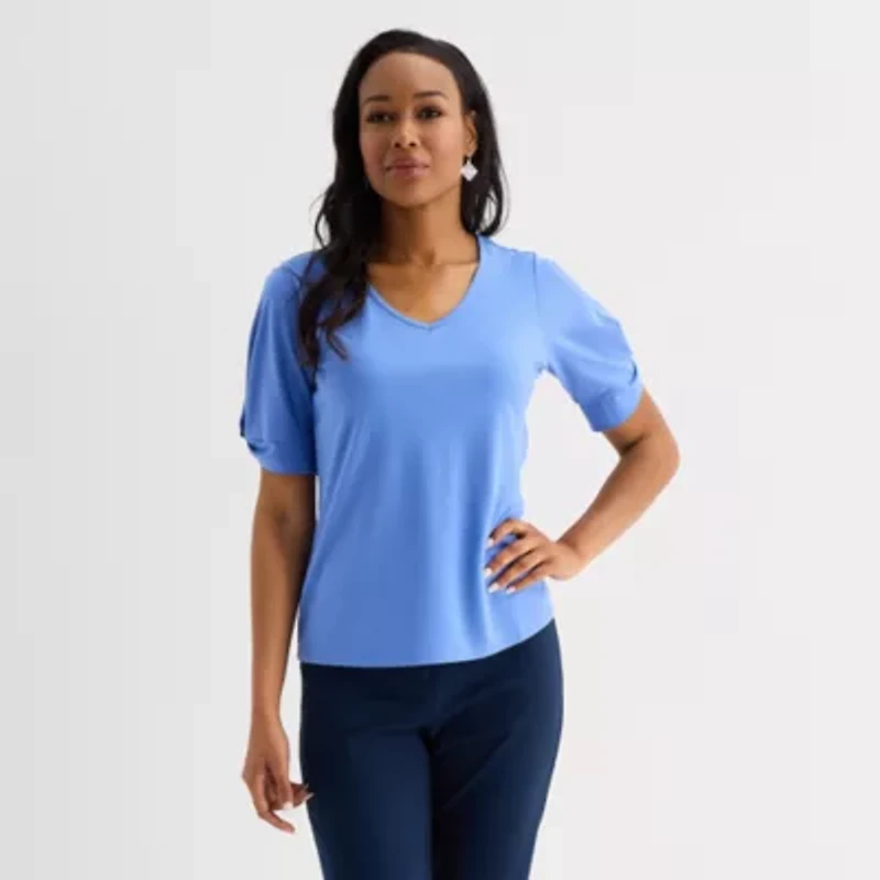 The twisted detail at the cuffs of this short-sleeve women's V-neck ponte top from Liz Claiborne elevates its basic design. Style yours with a pendant necklace and pair with wide-leg jeans.