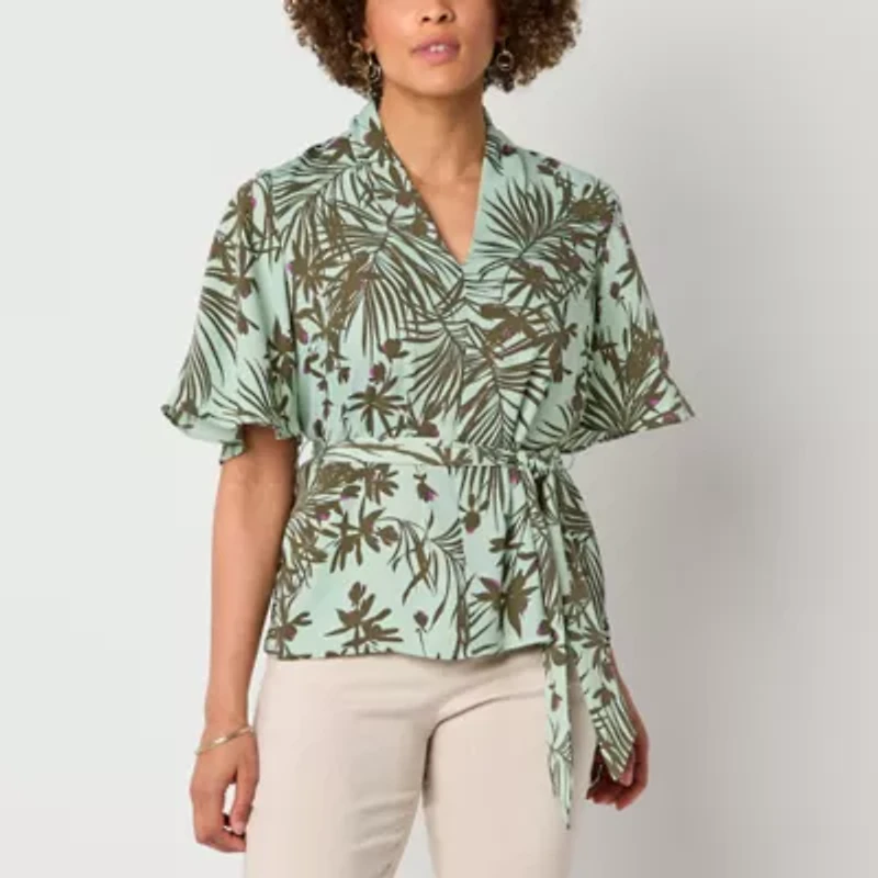 This Liz Claiborne women's blouse features an elegant seagreen palm print, making it the perfect elevated choice for a summer party or gathering. Made from soft satin, this top has a wrap v-neckline, a tie-waist and short bell sleeves. Wear it with capris or pants.