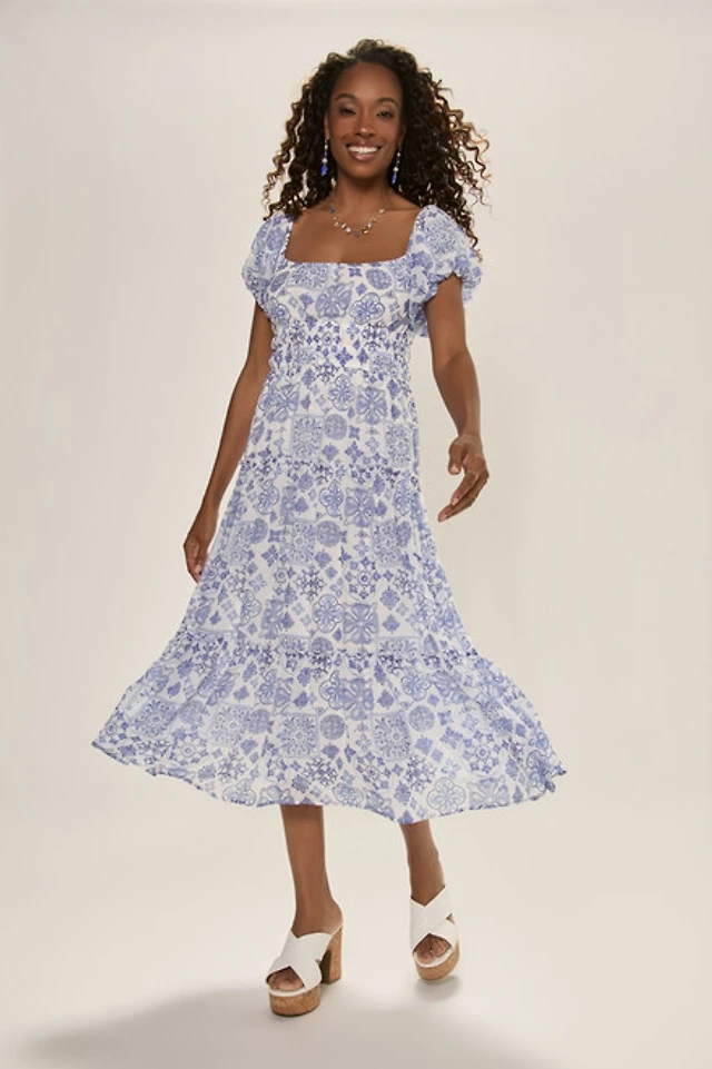 Liz Tile Print Tiered Midi Dress
