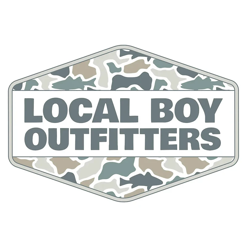 Display your Local Boy pride with this striking fish camo diamond crest decal. Featuring bold block lettering spelling "LOCAL BOY OUTFITTERS"