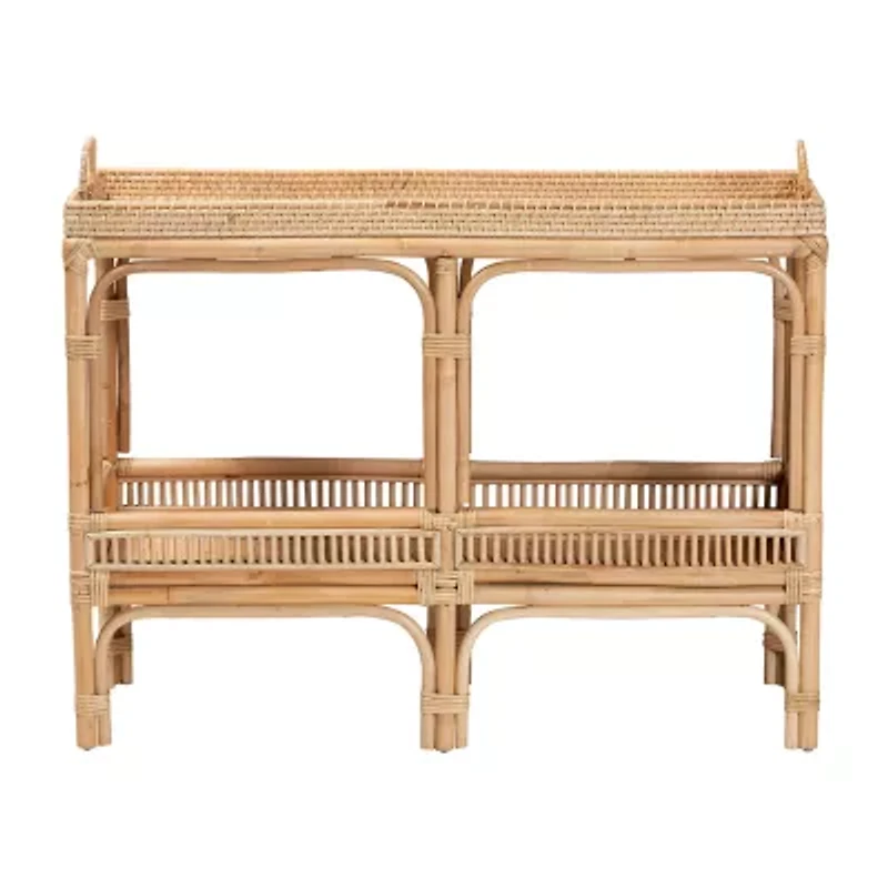 Nurture a tranquil ambiance in your space with the soothing tones of the Lombok console table. Made in Indonesia, this bohemian piece is entirely crafted from natural rattan. The wide tabletop serves as a wonderful display area while the lower shelf conveniently organizes larger items. The Lombok will arrive fully assembled and features ergonomic handles at its sides for easy transportation. A stylish yet practical solution to your storage needs, the Lombok console table is a fantastic upgrade to any layout. Due to the nature of the natural materials used in this product, it may have variations in areas such as, but not limited to, color, pattern, grain, and texture. The hair-like strands of rattan/rattan-fiber are common due to nature of the material. Overall: 39.40" w x 15.00" d x 30.10" h; top open shelf tray: 39.25" w x 14.75" d x 2.00" h; bottom open shelf tray: 39.25" w x 14.75" d x 18.10" h; legs: 7.50" h;