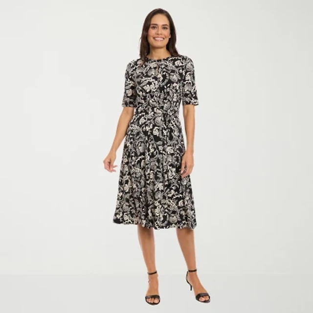 Black Label by Evan-Picone Womens Short Sleeve Floral Midi Fit + Flare Dress