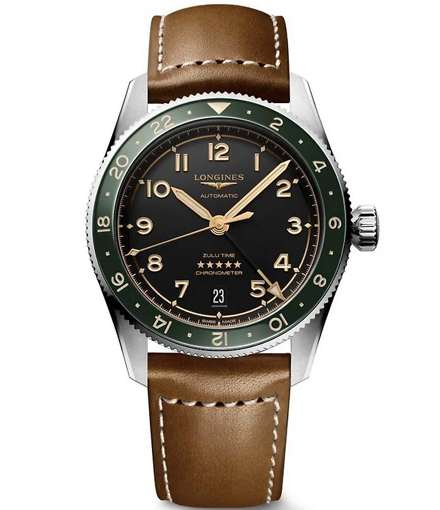 Longines Men's Swiss Automatic Spirit Zulu Time Brown Leather Strap Watch 39mm