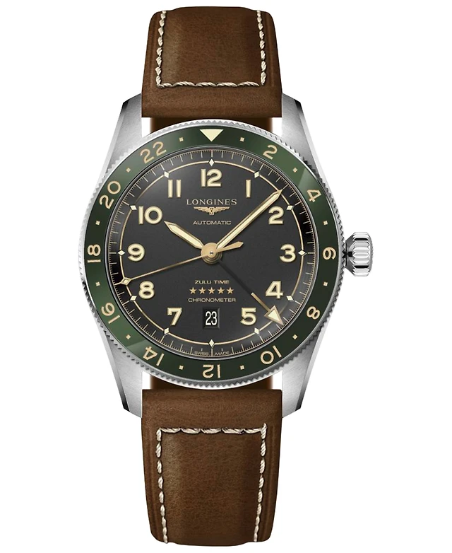 Longines Men's Swiss Automatic Spirit Zulu Time Brown Leather Strap Watch 39mm