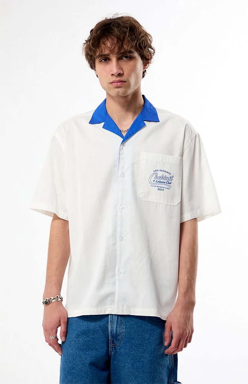 The Cocktail Woven Camp Shirt from Los Sundays brings laid-back, vacation-ready energy to your lineup. Featuring short sleeves, a camp collar, and a button-down front, it’s designed with a single chest pocket, Cocktail + Leisure Club graphics at the left chest and back, small side slits, and a relaxed fit for easygoing style.