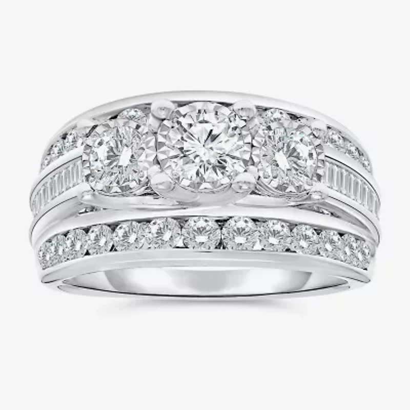 This stunning women's engagement ring features a brilliant three-stone design, with a round-cut Lab-Grown Diamond at the center, flanked by two slightly smaller round stones on either side. Crafted from 10K White Gold, the band is adorned with two rows of round-cut stones and a central row of baguette-cut stones, adding texture and bringing the total carat weight to 2 carats.
