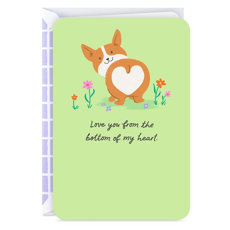 Just Because blank greeting card features a cute illustration of a smiling Corgi dog with a heart-shaped butt surrounded by flowers on a bright green background paired with a sweet, simple message of love. Blank inside for your personal note, this charming all-occasion card is perfect for birthdays, Valentine's Day, your anniversary, kids encouragement, miss you and more.