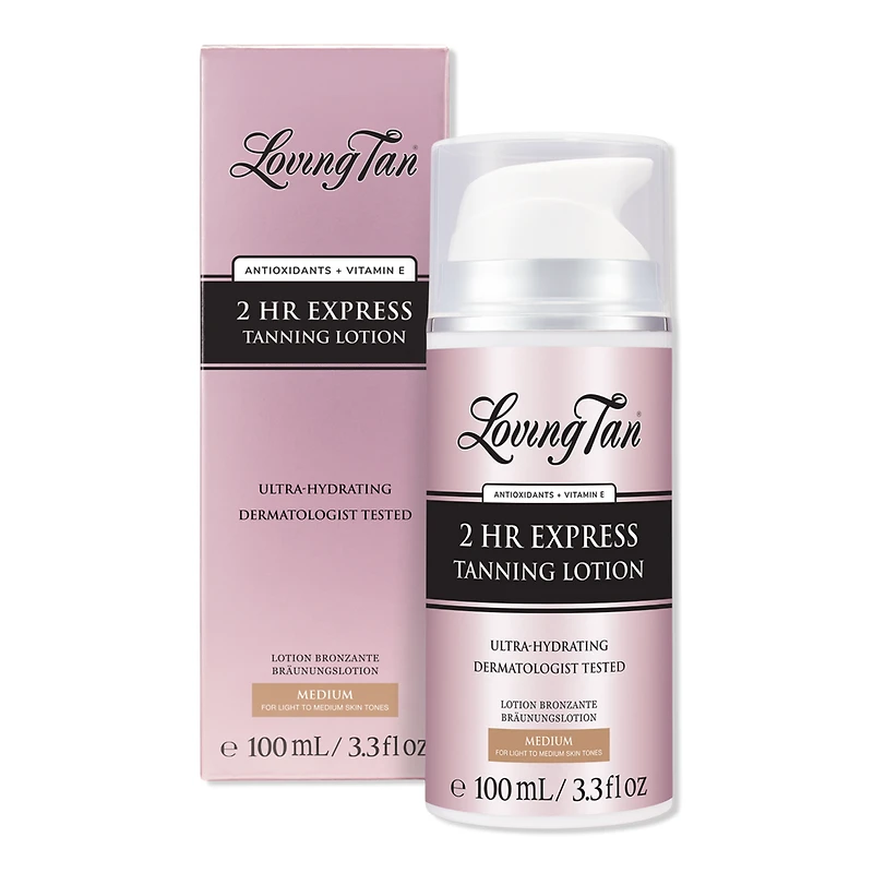 2 HR EXPRESS TANNING LOTION DARK 3.4OZ. Benefits: Treat your skin to the professional-level, natural-looking tan you've come to expect from Loving Tan's cult-favourite tanning mousses - now in an ultra-hydrating lotion infused with skincare actives.. Lightweight formula for a luxe application experience with hydrating shea butter, Vitamin E and antioxidant-rich coffee and aai extracts for a longer-lasting tan.. Formulated with an easy-to-apply color guide, a visible tint that shows exactly where the product has been applied, to ensure flawless coverage.. Fast-acting results in just 2 hours. Rinse off the color guide and see visible results, with your final tan developing into a deeper, natural shade over the next 24 hours.. Dermatologist tested. Best suited for Medium to Dark skin tones.. Proudly Australian made.. Medium - Best suited for Light to Medium skin tones.. Dark - Best suited for Medium to Dark skin tones.. Packaging may vary.. Features: Medium - Best suited for Light to Medium skin tones.. Dark - Best suited for Medium to Dark skin tones.. Key Ingredients: Formulated with the same proprietary naturally derived DHA blend, found in Loving Tan's professional-level mousses.. Infused with antioxidant-rich coffee and aai extract for healthy-skin.. Contains skin-enriching shea butter and vitamin E to hydrate and nourish your skin while your tan develops..