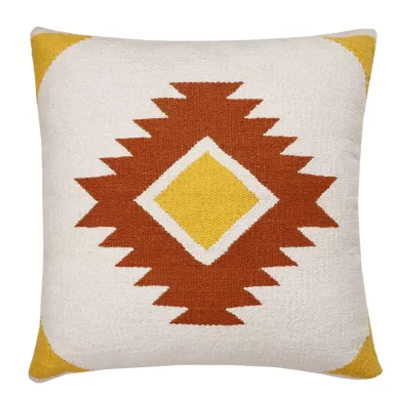 Designed with a balance of leisure and luxury in mind, this woven geometric diamond medallion accent pillow merges well with multiple decor styles from modern and contemporary to southwestern to boho-chic. This design is constructed of durable cotton canvas fabric making it a must-have throw pillow in any busy home or office space. Stand alone or layer with other accents, this patterned bed pillow brings cohesive colors of red-orange, yellow, and white to your pillow collection with its trendy toned fabric front. 100% Cotton Cover with Polyfill Insert. Hand-woven by artisans in India with keen attention to detail. Zipper closure for easy insert removal. Dimensions: 20" x 20", perfect size for dorms, apartments, living rooms, and bedrooms. Spot Clean: Mix a couple cups of cool water with a teaspoon of dish soap.�Next, dip a section of a clean, white fabric towel into the soapy mixture and wring out as much water as possible. Blot the stain with the white fabric towel and repeat as necessary until the spot is removed.