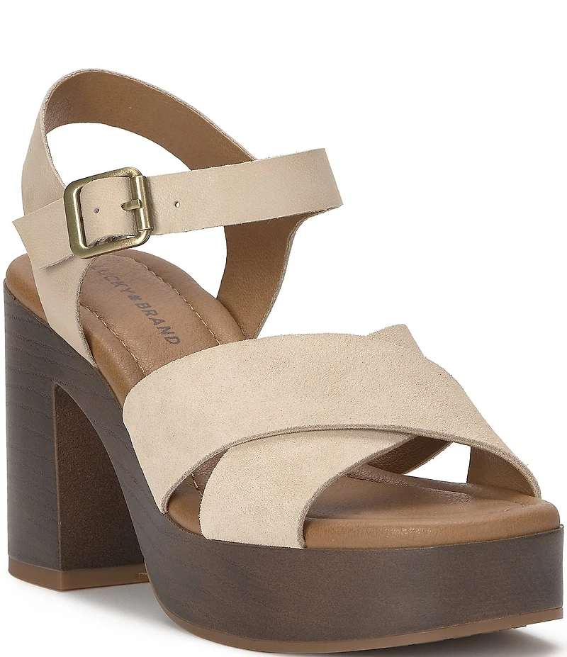 From Lucky Brand, the Carsen Cross Strap Platform Sandals feature: Suede upper Ankle strap with buckle closure Synthetic lining Rubber outsole Approx. 1.3" platform height Approx. 3.5" heel height Imported.
