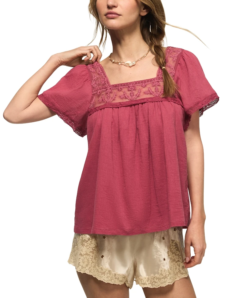 Show off feminine charm with this Lucky Brand blouse featuring a square neckline and short sleeves. Mesh lace details add a playful texture, suitable for evening outings.