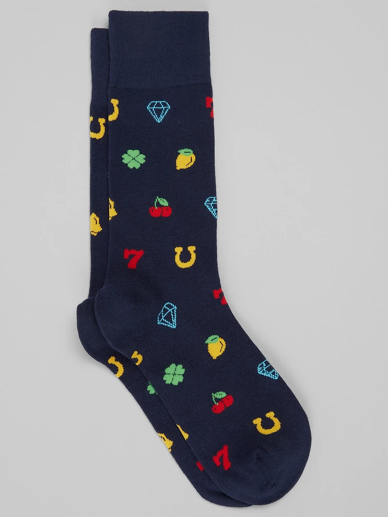 These cotton‑blend socks are a wearable lucky charm. Spun soft, comfy, and impossibly cozy, they're sprinkled with cheerful symbols of good vibes like lucky 7s, shiny horseshoes, and classic four‑leaf clovers. Whether you're chasing rainbows, good style, or just a really good sock day, this playful pair has you covered.