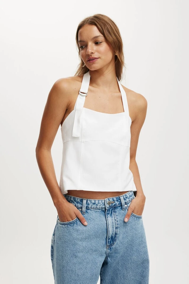Set to be your new wardrobe staple. The Luis Halter Seam Top is all about that tailored, backless moment. Square neckline, halter ties, and metal buckle detailing give it structure and edge. Easy to dress up, down, or somewhere in between with jeans, it's the one that always works.