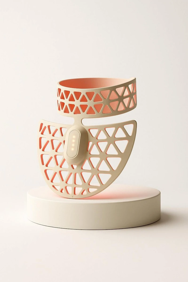 Feather Neck & Decollete LED Mask. Benefits: Helps reduce the appearance of fine lines and wrinkles. Supports firmer-looking skin. Enhances radiance in the neck and dcollet. Improves the appearance of uneven skin tone. Perforated, feather-inspired design helps evenly distribute LED light across a broader treatment area. Flexible design contours comfortably to delicate neck and chest skin. Features: Red LED light (630 nm 10 nm). Near-infrared LED light (830 nm 10 nm). Flexible, perforated silicone construction. Feather-light, contoured design. Hands-free, adjustable wearable format. Multiple timer settings. Key Notes: Red LED light is selected for visible aging concerns. Near-infrared LED light is designed to reach deeper skin layers. Perforated design enhances flexibility and comfort. Designed to complement LED face treatments.