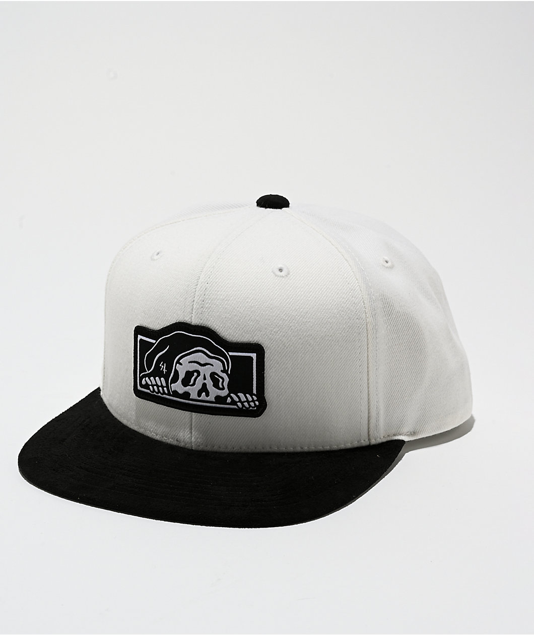The Logo black and white snapback hat from Lurking Class by Sketchy Tank features the iconic hooded skull patch embroidered on the crown. With its white crown, black bill, and flat brim, the hat offers sharp contrast and a signature Sketchy Tank atti