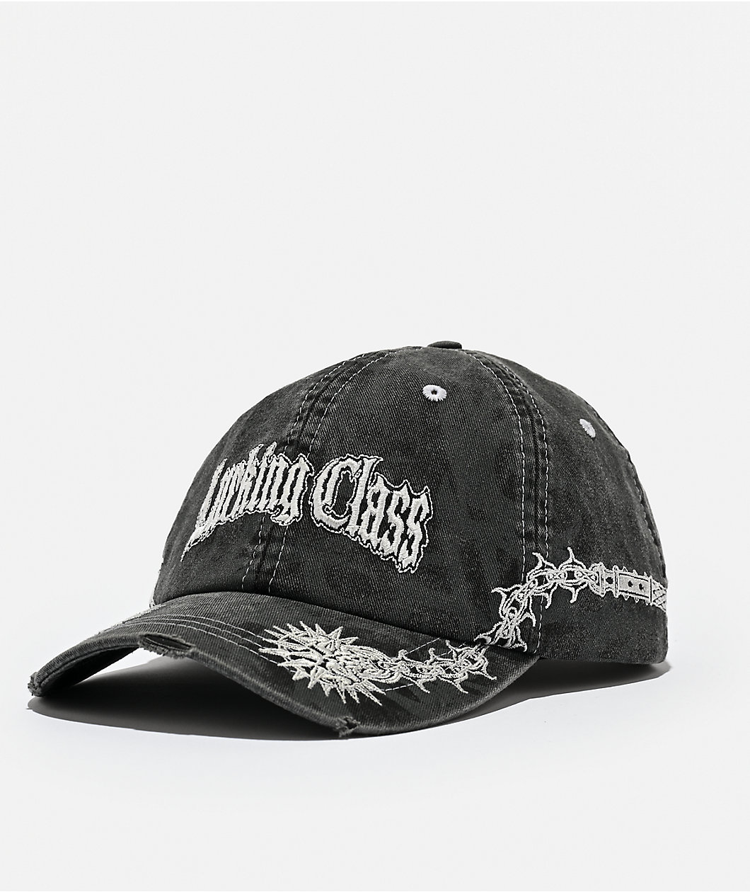 Embrace your counterculture style with the Maced strapback hat from Lurking Class by Sketchy Tank, created in a washed black cotton construction with embroidered and printed graphics. Showing subtle distress rips along the edge of the curved bill to