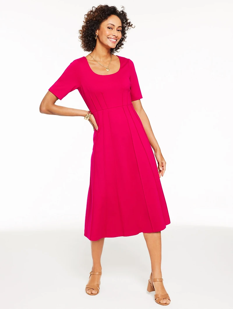 Luxuriously soft fabric with amazing stretch and recovery. Style that slims and streamlines your shape in beautifully rich colors. Impressive for work and travel. Our polished fit & flare midi dress is beautifully crafted with seam detailing for an ultra-flattering fit and on-seam pockets. A must-have for workdays and dinner dates.