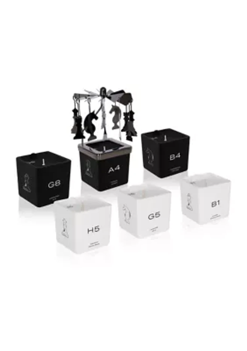 The MIND GAMES collection of artisanal candles captures the elegance and strategic brilliance of chess. Each exquisite candle is meticulously crafted, featuring sophisticated design and captivating fragrances. This set of six 2 oz/ 56 g candles is accompanied by a carousel that rotates when touched by the heat of the candle flame. The spinning carousel projects enchanting light and shadow effects inspired by the chess pieces the MIND GAMES collection represents. Gift Set Includes: G 8 - Black King Labdanum and oud are skillfully blended with earthy notes of oakwood and vetiver, heightened by the refreshing fragrance of grapefruit and delicate pink roses. A4 - Black Queen Luminous floral notes, cassis, and exotic pink pepper are beautifully balanced with warm notes of amber and musk. B4 - Black Knight Bold citrus fruits are layered against distinctive woody notes, with rich hints of cassis and strawberry, and a warm finish of amber. B1 - White King Addictive cherry is contrasted with delicate rose and jasmine petals, harmoniously accompanied by creamy sandalwood and tonka bean notes. H5 - White Queen The fragrance opens with vibrant bergamot and a hint of saffron, seamlessly merging into the rich heart of tobacco. The creamy scent of tonka bean envelops the opening elements, enhancing the sweet and intimate facets of the tobacco. G5 - White Knight The candle unfolds with a floral bouquet featuring bold notes of iris and freesia, which are then beautifully intertwined with the creamy essence of jasmine and enriched with soothing hints of vanilla and milk. An elegantly crafted carousel with pendants that fits securely on top of each candle in the gift set. Imported