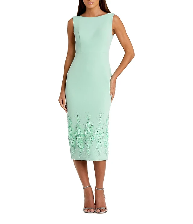 Mac Duggal Boat Neck Sleeveless 3D Floral Applique Crepe Sheath Midi Dress