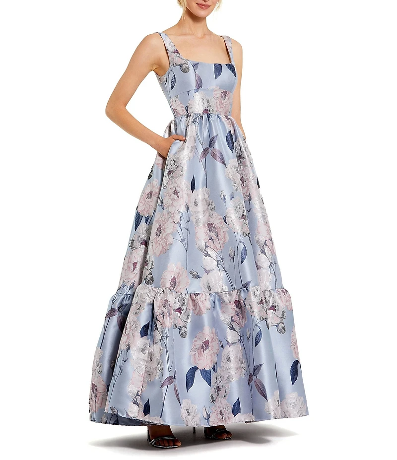 From Mac Duggal, this dress features:  Jacquard fabrication  A line silhouette  Square neckline  Sleeveless  Floral print  Zip back closure  Approx. 60" length  Polyester Dry clean  Imported.