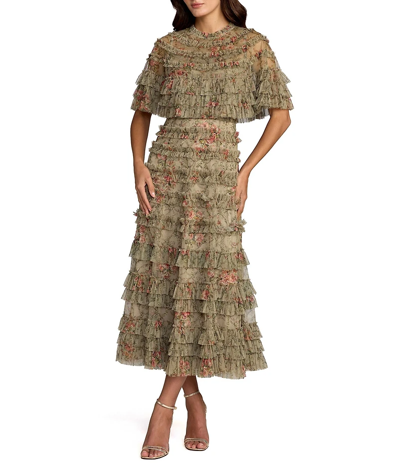 Mac Duggal Capelet Floral Print Micro Ruffle Midi Dress
