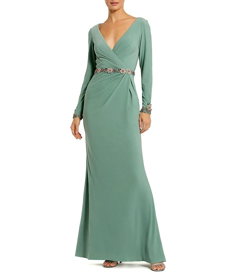 Mac Duggal Jersey Long Sleeve V Neck Beaded Belt Gown