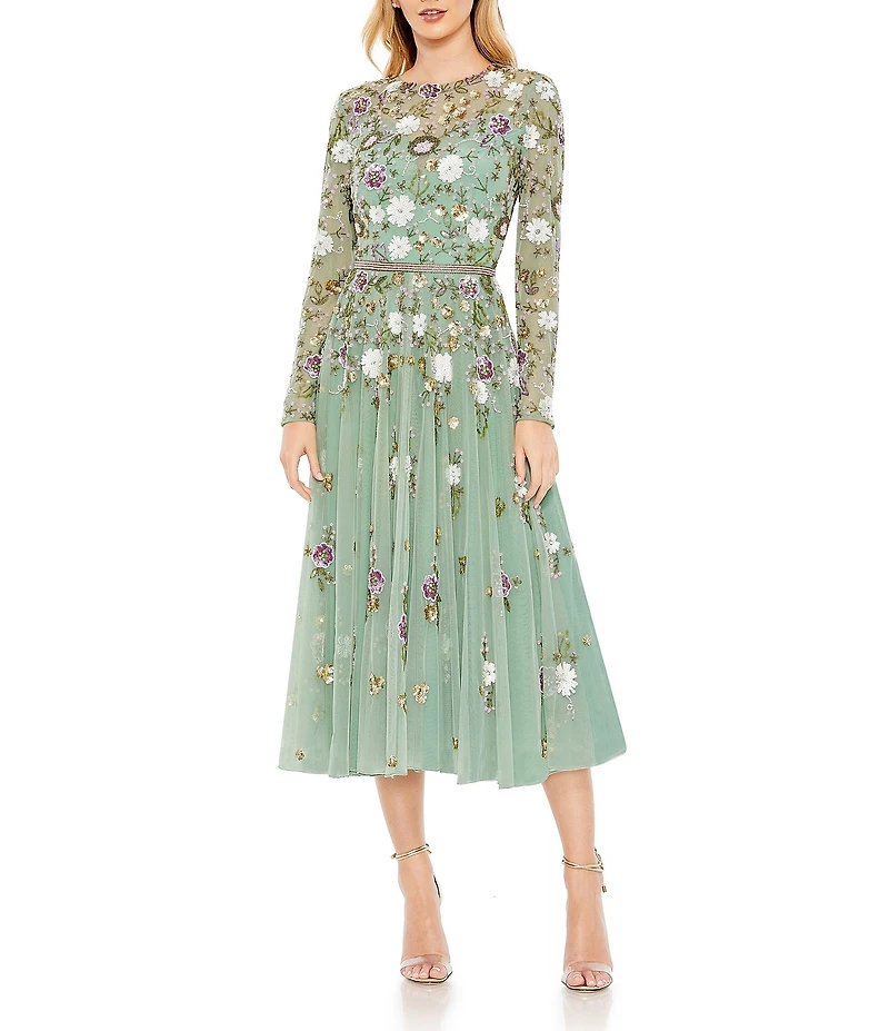 Mac Duggal Sequin Floral Crew Neck Long Sleeve Midi Dress
