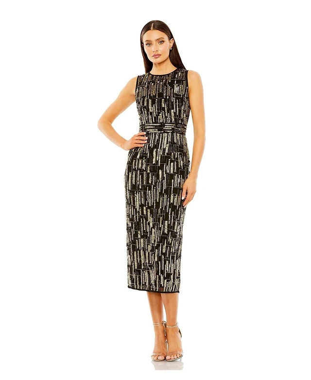 Mac Duggal Women's Sleeveless High Neck Beaded Midi Sheath Dress