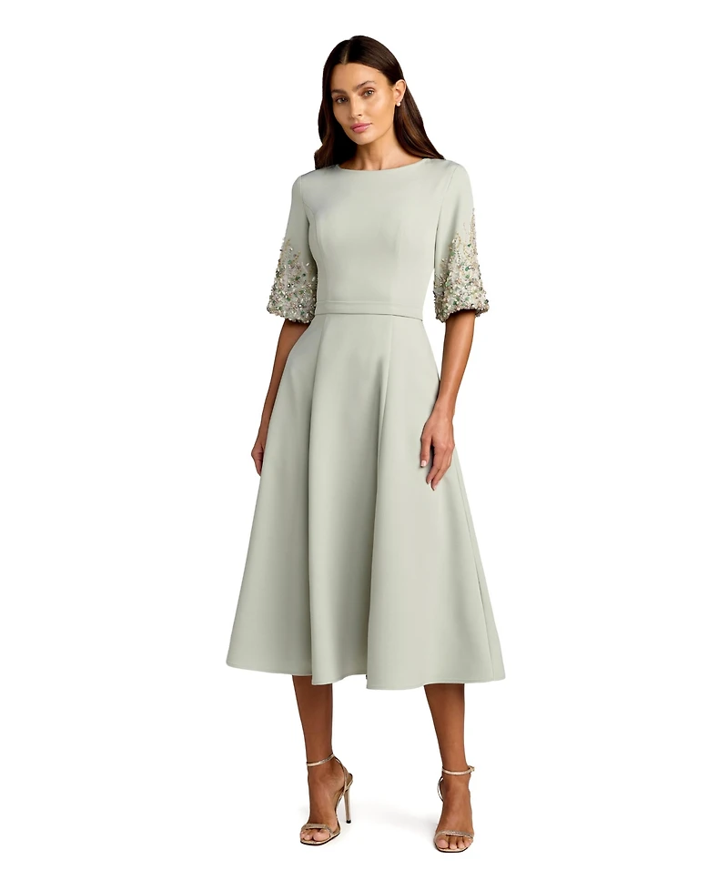 Mac Duggal Women's Crepe A Line Midi Dress With Beaded Sleeves
