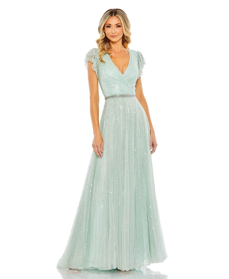 Women s embellished tulle gown featuring a plunging V-neckline, flutter sleeves, and a sparkling beaded waist. Flowing floor-length skirt creates a flattering A-line silhouette, perfect for weddings, formal events, galas, and evening occasions here.