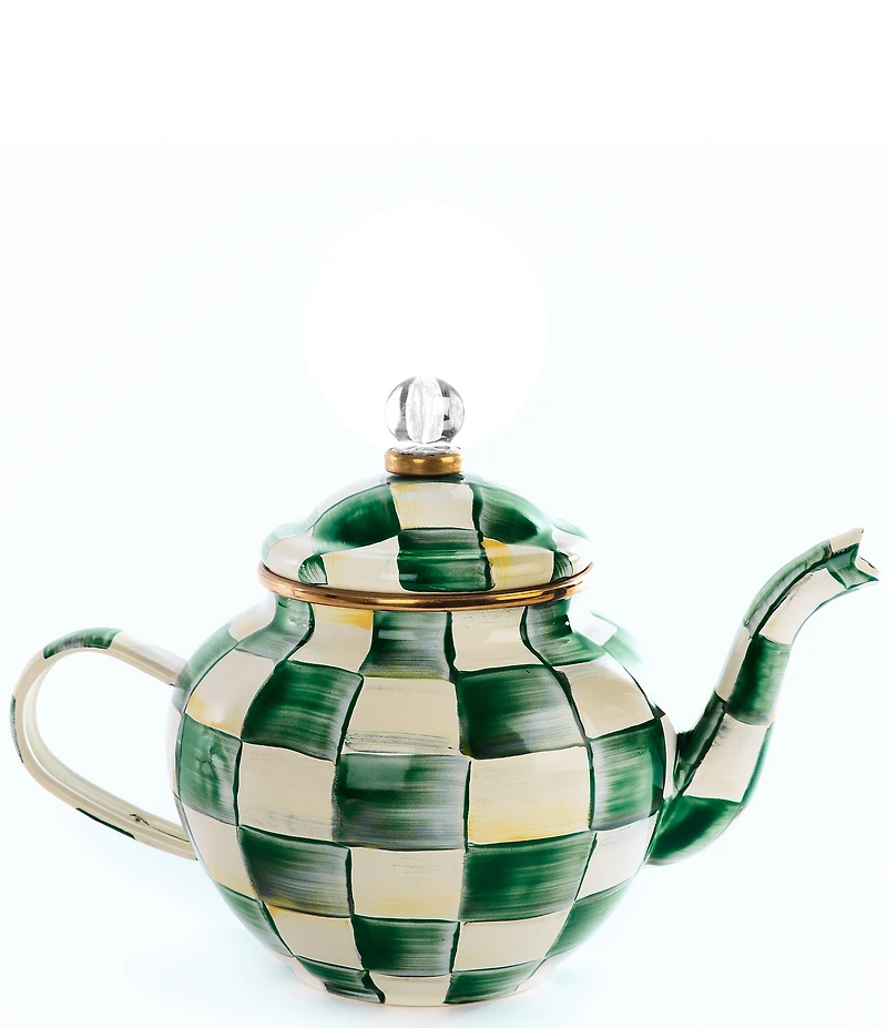 From MacKenzie-Childs, this teapot features: You won't be able to resist our 4 Cup Check Teapot, short and stout indeed Hand-painted enameled steel in a range of hues shaped into the most adorable little form imaginable: sized just right for English Breakfast in the morning with the newspaper, Earl Grey in the afternoon with a baked treat, or chamomile in the evening with the book you just can't put down. Enough for two, or plenty for you 9" wide handle to spout, 7" tall, 4 cup capacity Heavy-gauge, hand-glazed steel underbody with hand-painted Checks, rimmed in bronzed stainless steel with glass and brass accents Lid is topped with a glass finial Pieces may vary due to the handmade nature of each product Hand-wash with mild soap and dry immediately Do not microwave Use caution with hot liquids. If the handle is too hot to hold, then the beverage is too hot to drink Our enamelware exceeds both federal food safety regulations and California's Proposition 65, the strictest environmental safety standards in the U.S. Handle enamelware with care and discontinue use for food service if it becomes chipped, cracked, or broken. Imported.